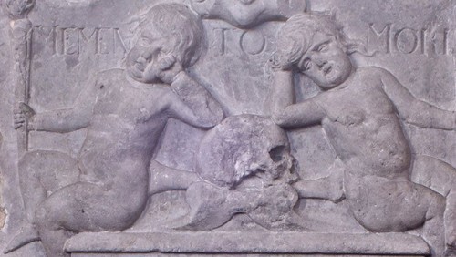 Beschreibung: Die mit erhabener Inschrift versehene Tafel ist mit Blütengirlanden umrahmt. Über dem Rahmen befinden sich zwei trauernde Putten, die sich mit einem Arm auf einen Totenschädel stützen. In der anderen Hand hält jede eine aufrechte brennende Fackel. Auf der volutenbekrönten Tafel hinter ihnen steht: MEMENTO MORI. Am Fußende ist eine Sanduhr mit einem Drachen- und einem Engelsflügel zu sehen. Sanduhr und Totenschädel sind beschädigt.